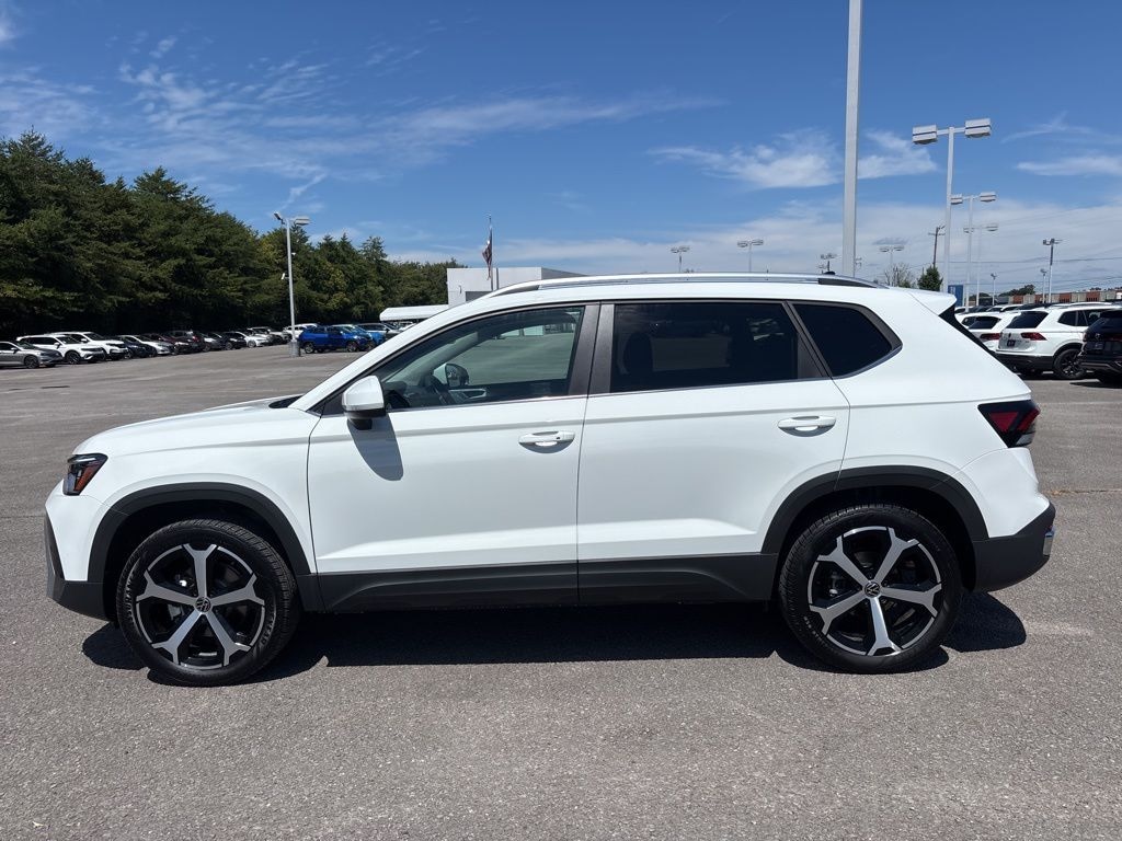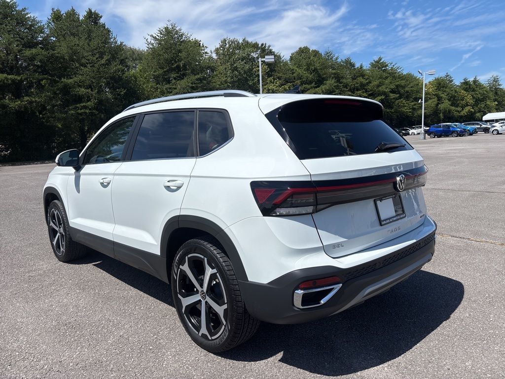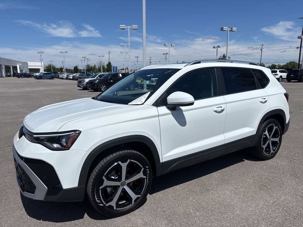 Pure White 2025 Volkswagen Taos 1.5T SEL AWD 8-Speed Automatic with Tiptronic 1.5L I4 Turbocharged DOHC 16V LEV3-SULEV30 174hp Auto-Dimming Rearview Mirror w/HomeLink Connect, Rubber Mats Kit, VW Care.