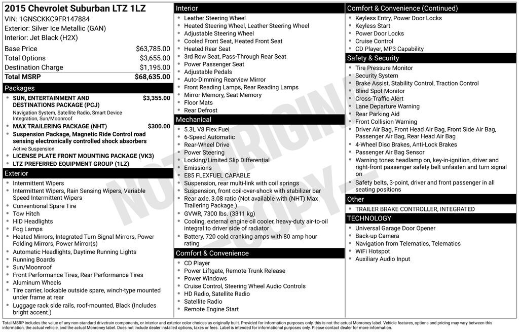 This 2015 Chevrolet Suburban LTZ is a true standout in the full-size SUV segment, combining unparalleled capability, premium comfort, and advanced technology. Experience the difference for yourself â" schedule a test drive today and discover the exceptional value this Suburban has to offer.