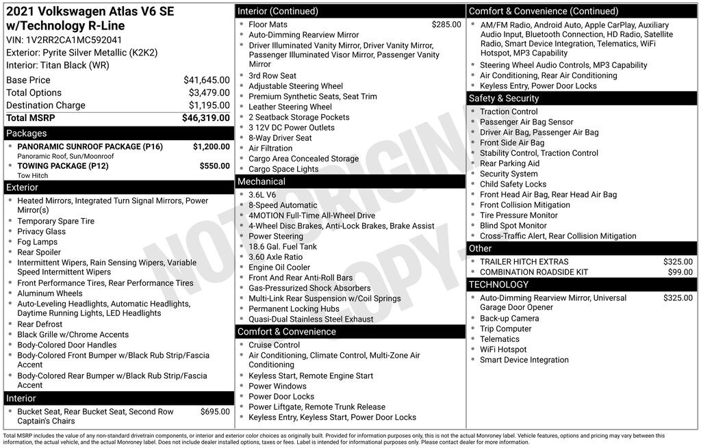 (Warning- a little long) We were looking for a roomy 3 row SUV with easy access to all 3 rows. After a ton of research and multiple test drives of the possible options, we settled on the VW Atlas, SEL Premium. We’ve owned our Atlas for a little over a month now. We’ve taken it on a couple of long trips (1000+ miles), so we’ve seen enough to write a decent review. The Atlas was one of 4 finalists for us. The others were the GMC Acadia, the Chevy Traverse, and the Infiniti QX60. These were our finalists for one primary reason- access to the rear seat with car seats installed in the middle row seats (without climbing into the middle row, and going through the middle space between the captain’s chairs). No other 3 row SUVs had this option, although I understand some will have it for the 2020 model year. Because we only had 4 models to look at, we focused all our attention on these models. Likes: Third row access is incredibly easy in the Atlas. By pulling up on the release on the top of the seat, the entire seat tips forward, and then slides forward, leaving a large opening to access the rear seat, and allowing us to buckle our 4 year old into that seat very easily, even while standing outside the car. This middle row seat movement can be performed with a car seat installed in the middle row seats, a maneuver that very few 3 row SUVs are capable of. The Infiniti QX-60 has a similar setup, and it is just as easy to use. The Acadia and Traverse also have this option, but during our test drives, we found the mechanism to be incredibly difficult to use. The salesman said it was probably just stiff, but it was almost impossible for my wife to get the seat to move, and it happened in both of those models. Also, the GMC and Chevy only have this capability on the passenger side, which is highly annoying. The interior of the Atlas is HUGE, the door openings are very wide to provide easy access, and it is very comfortable. The seats in the Atlas were by far the most comfortable of any vehicle we tested. When I say that, I mean ALL of the seats, to include the 2nd and 3rd rows, and the 3rd row is actually usable by adults. I am 5’10”, and I was very comfortable back there. I would not say the same of the other three vehicles tested. Also, the middle row seats of the Chevy and GMC were very uncomfortable. The had a weird shape, with a weird forward “hump” that hit right between the shoulder blades. I’m sure this has something to do with crash safety or something like that, but those seats were just extremely uncomfortable. Our Atlas is equipped with a panoramic sunroof, which is pretty cool. It also has a power sunshade for the sunroof. The Chevy and GMC have a very cheap, manual cover. It is spring-loaded, and if you accidentally let go of it, it will snap back like a window shade. At this price level, it should be a power sunshade. While we are on the topic of sunshades: the 2nd row windows in the Atlas have built-in sunshades, which is ingenious! I wish all cars had this feature. The Atlas has an infotainment system that is easy to use and intuitive, and it allows for swiping and pinch zooming. Apple Car Play is awesome! Surprisingly, some manufacturers have not integrated this feature at this time. The digital instrument panel has a very nice, modern look, and it offers 5 or 6 different views. One of the really cool things about the Atlas- you can display the nav map in the middle of the instrument panel. Additionally, you can make the map bigger and the gauges smaller, which allows you to see more map detail- a really nice option. The car even has an altimeter, which is really cool to me (I’m a pilot by trade). Not so much for my wife… The Atlas allows for 4 customizable driver settings. It also has an overhead view camera, which allows you to see a birds-eye view of the vehicle- very handy to ensure you are actually centered in that parking spot! (this is only offered in the highest trim level) The car also has a traditional shift lever. This appeals to me, because I’m old school. The Atlas has a very nice exterior, and it looks great from both the front and the back. The LED headlights are really nice, and much brighter than standard headlights. Also, the daytime running lights look really cool (I noticed that when another Atlas pulled up behind us on the freeway). It also has a small turn radius, which makes maneuvering in tight spaces much easier. The Atlas has a few other really nice options- adaptive cruise control, auto-dimming headlights, auto-wipers, and an auto-park feature (highest trim level only) for parallel and back in perpendicular parking. The cruise control also has an option to speed up or slow down in increments of 5 mph in addition to the more standard 1 mph increment, which is handy. It also has a feature that turns on the fog light on the side of the car in the direction of a turn, providing extra light for making the turn safely. You can also lock the middle row seat HVAC controls, to prevent the inevitable arguments from the kiddos! One of the best things about the Atlas is the industry leading warranty- 6 years/72k miles, bumper to bumper. Very few of the competitors even come close to this. And it is manufactured in the USA, which I really like. Now let’s talk about the things I don’t like about the car. (And believe me when I say these things are pretty minor in the grand scheme of things…) The biggest gripe I have is the engine power. Given that my primary goal with this vehicle is to comfortably get a lot of people from point A to B, this isn’t a huge deal. I didn’t buy this car to qualify for the Indy 500, but I do wish VW offered some different engine options, like a V-8 or a turbo V-6. They do offer a turbo 4 cylinder, but it is not offered above the base trim level, and I don’t think it is anything more than adequate for this car anyway. A close 2nd for cons would be the height of the front seat armrests (on the door side of each